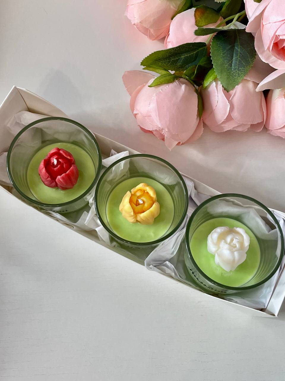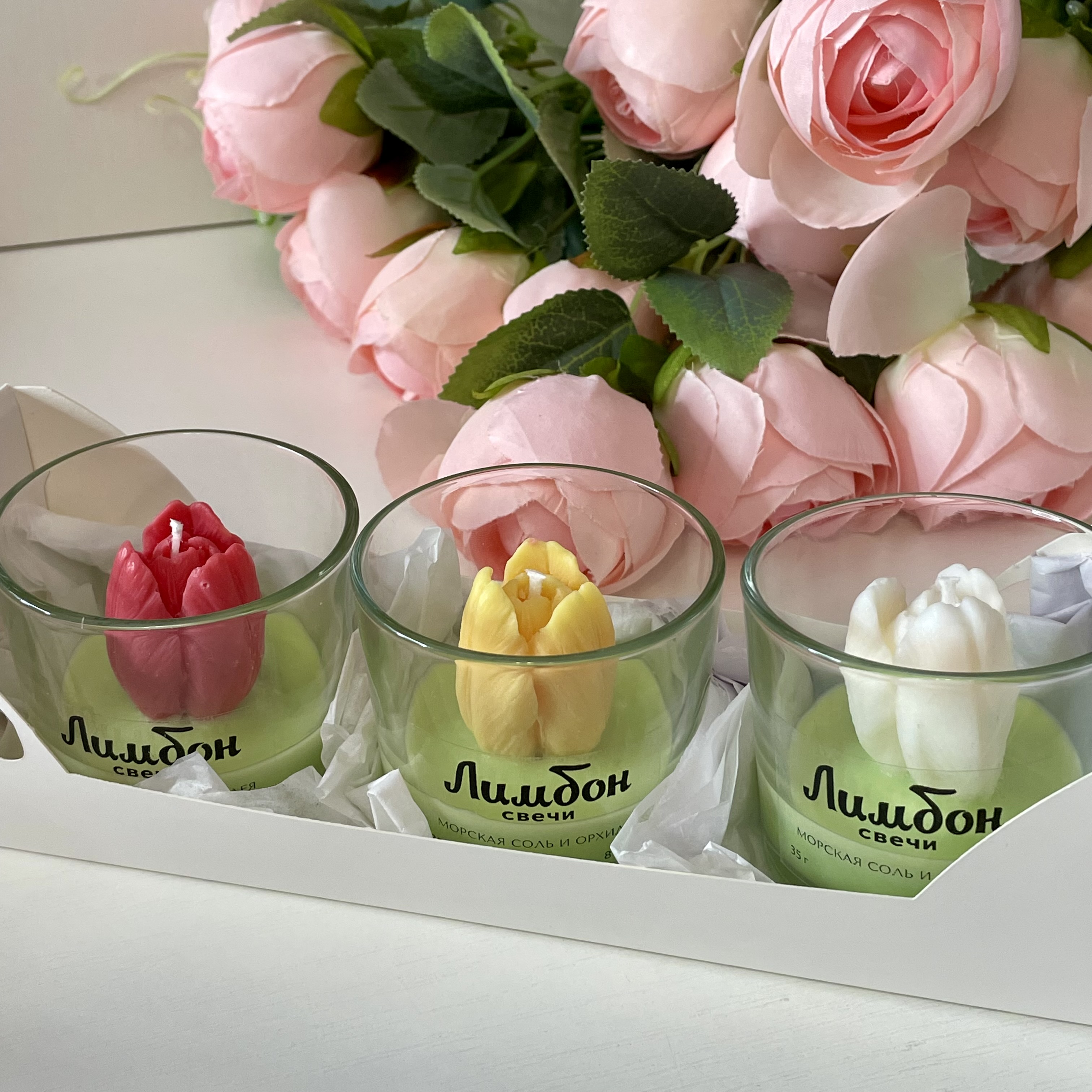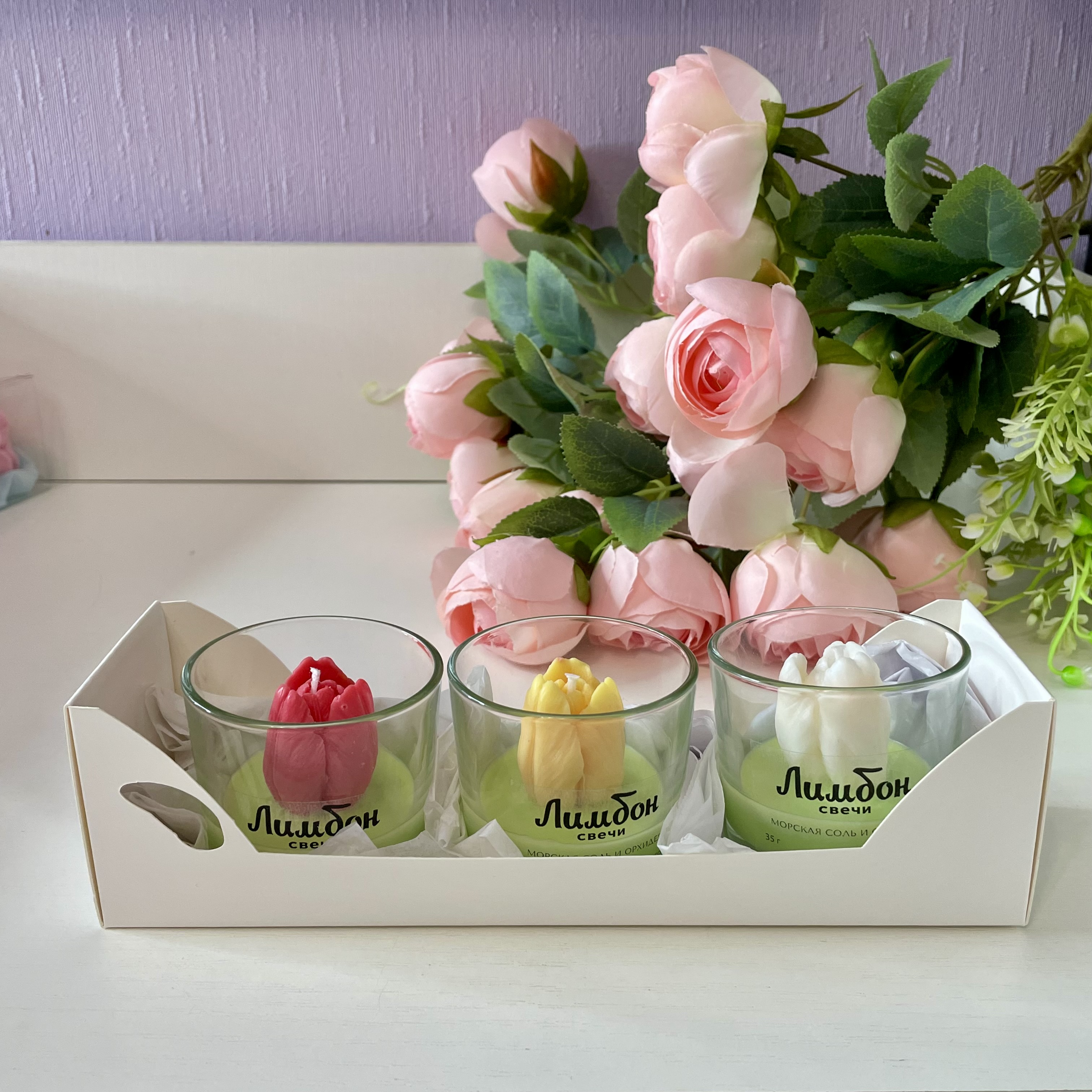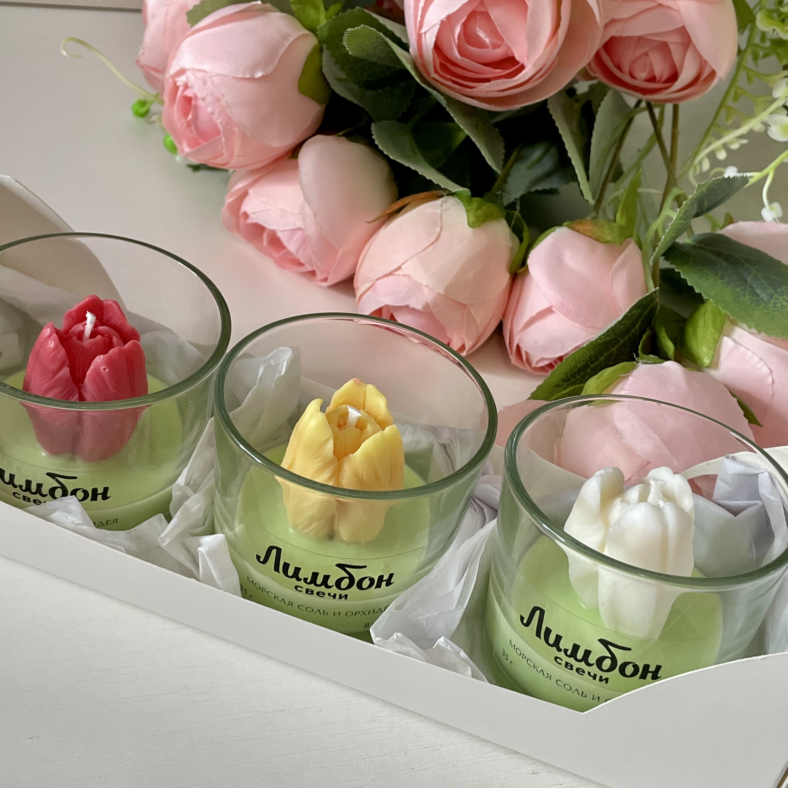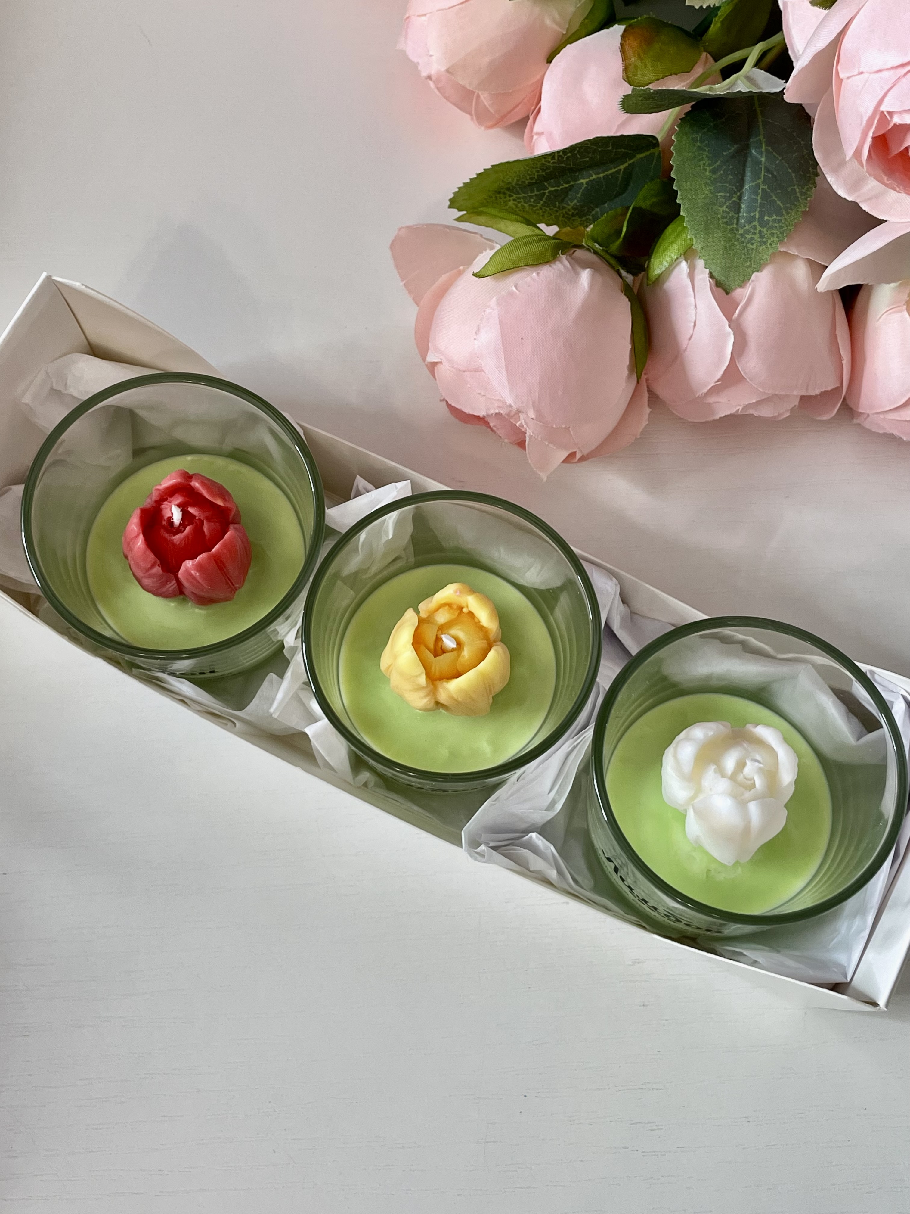 В набор входит 3 ароматические свечи с декором в виде тюльпанов.