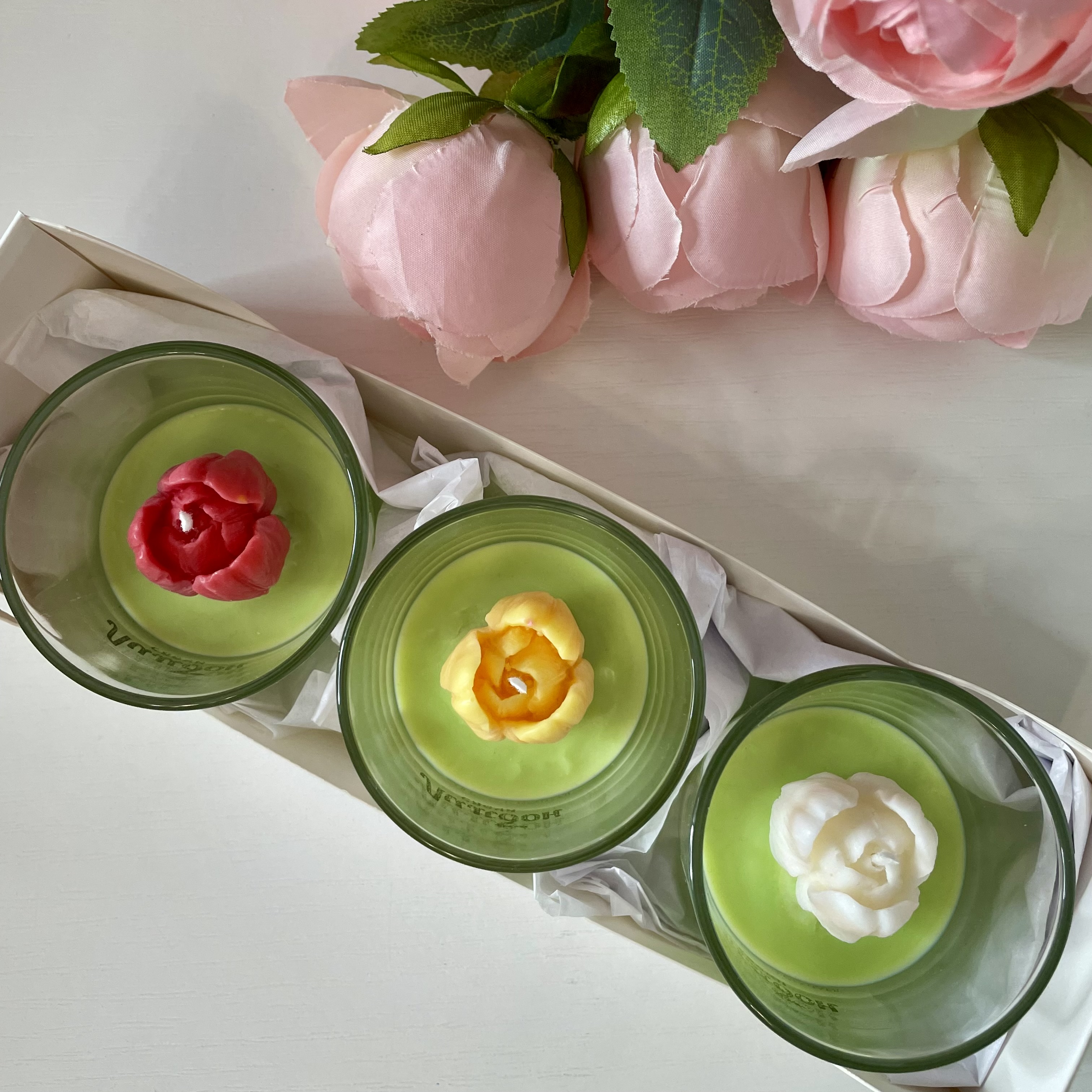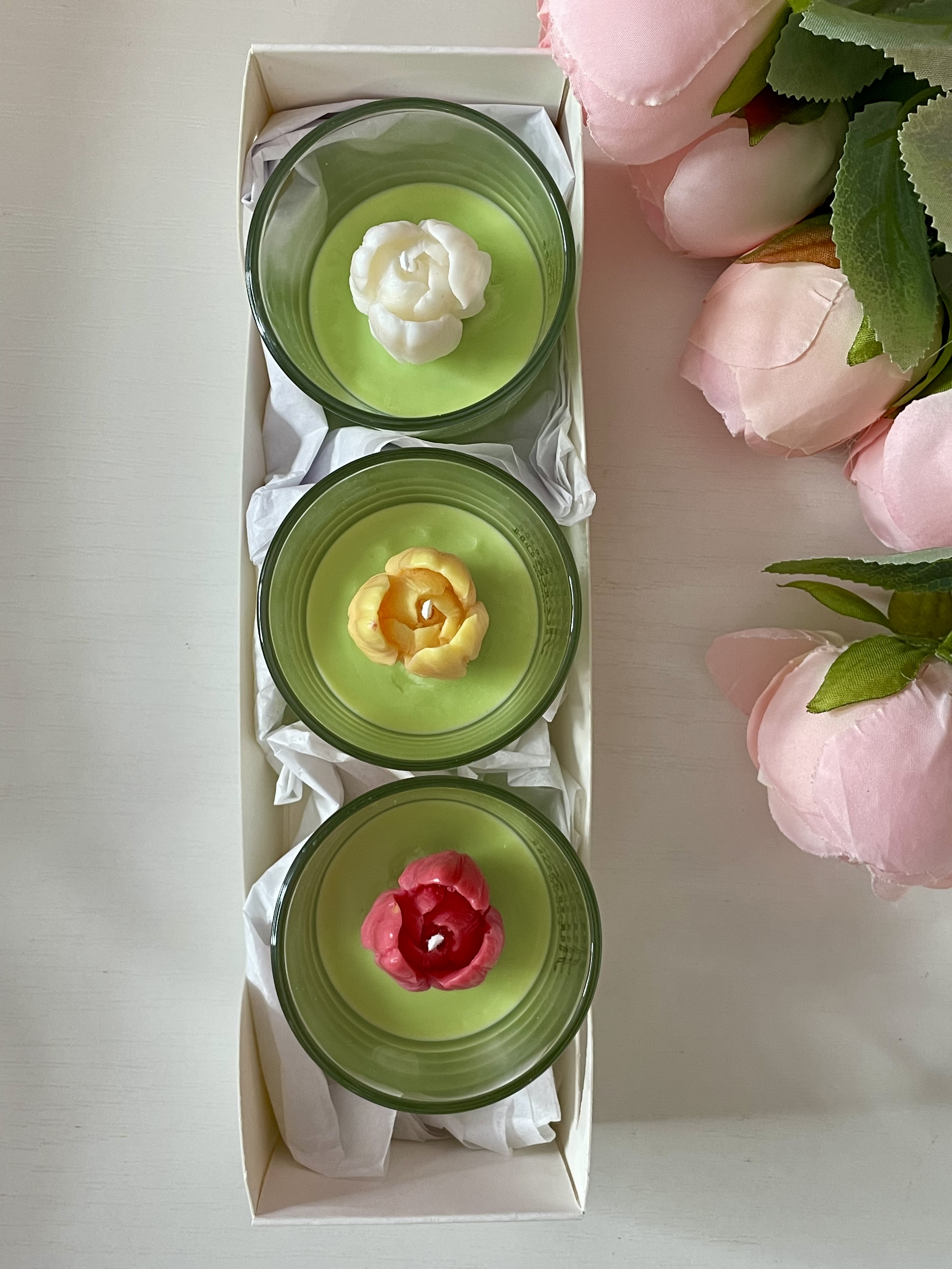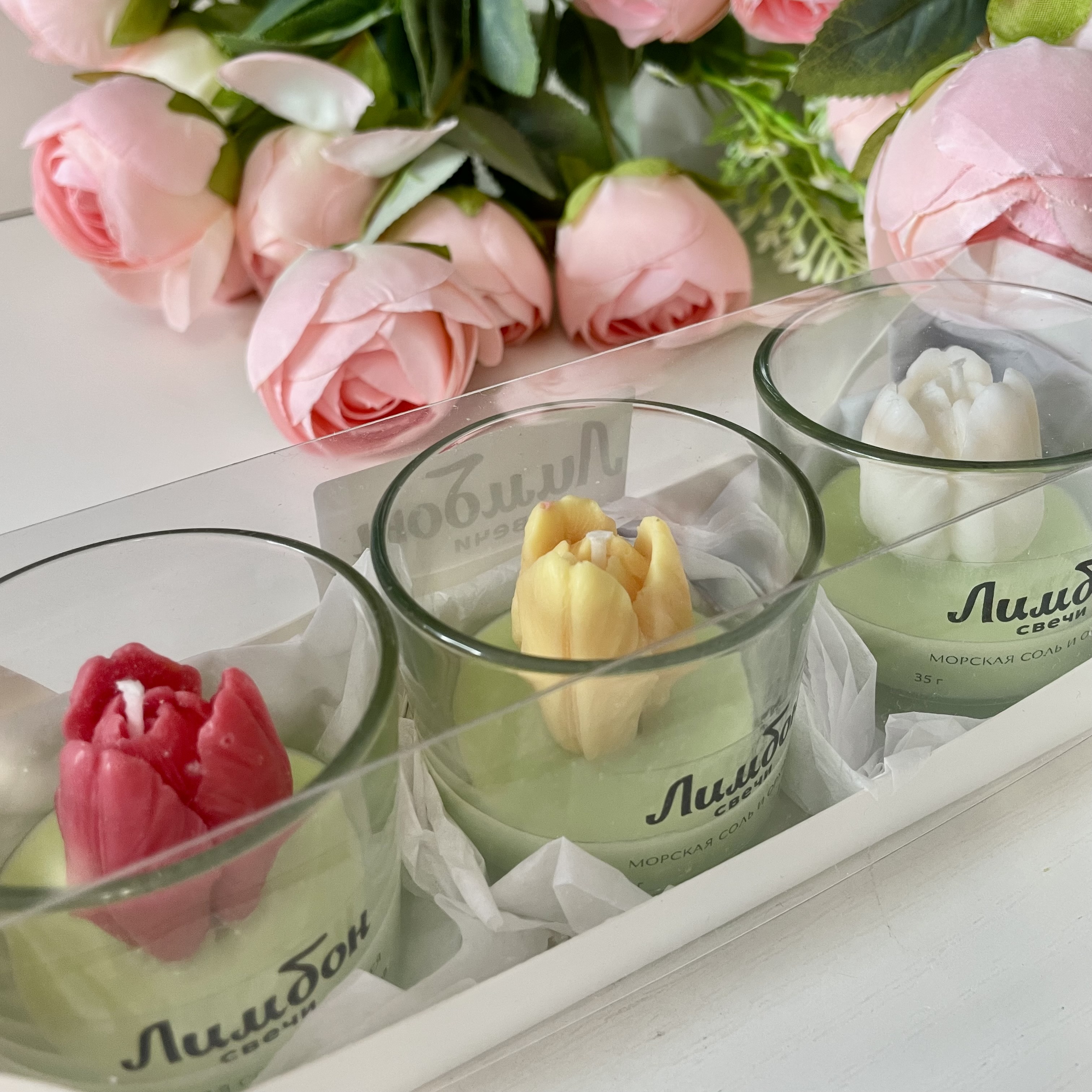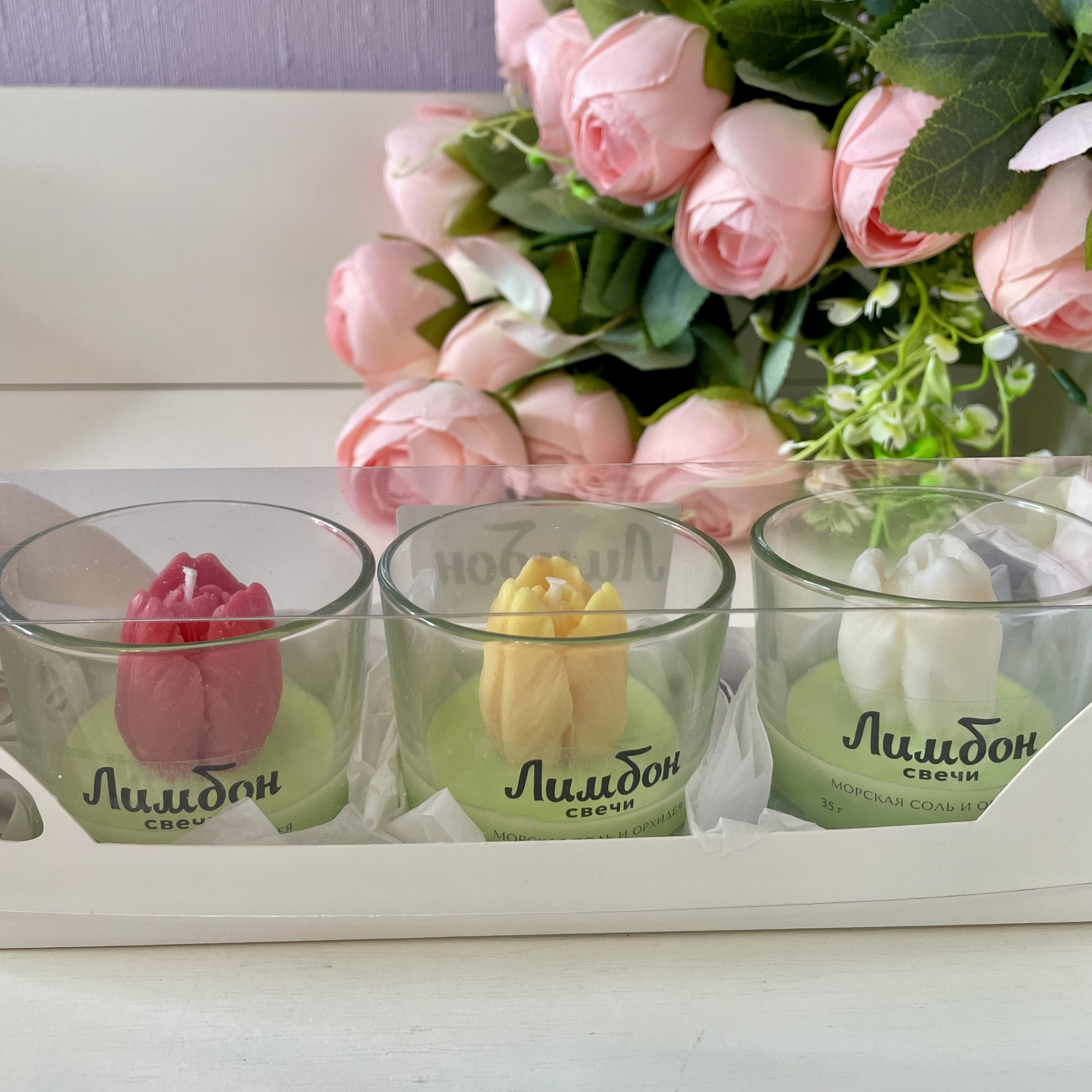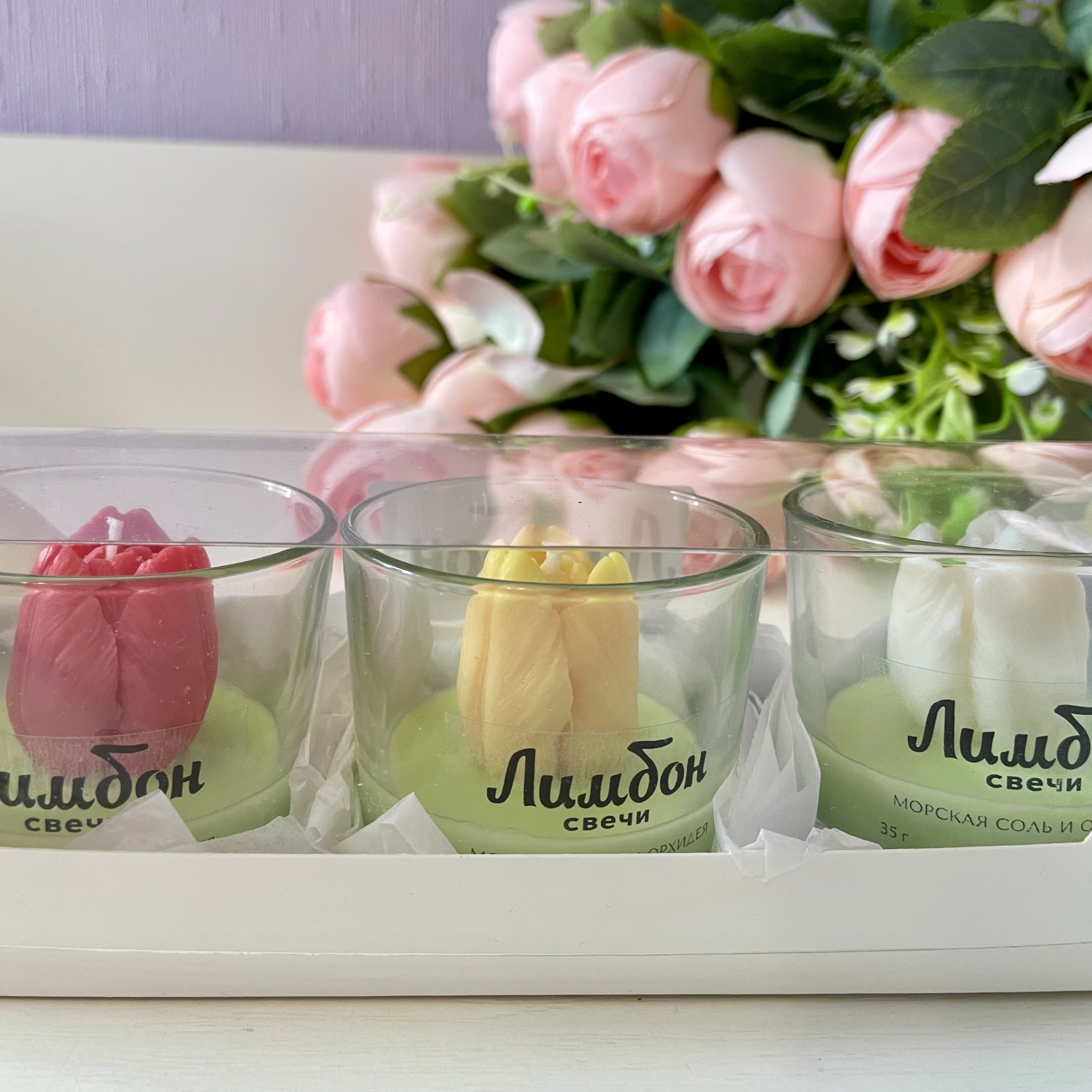 В набор входит 3 ароматические свечи с декором в виде тюльпанов.
