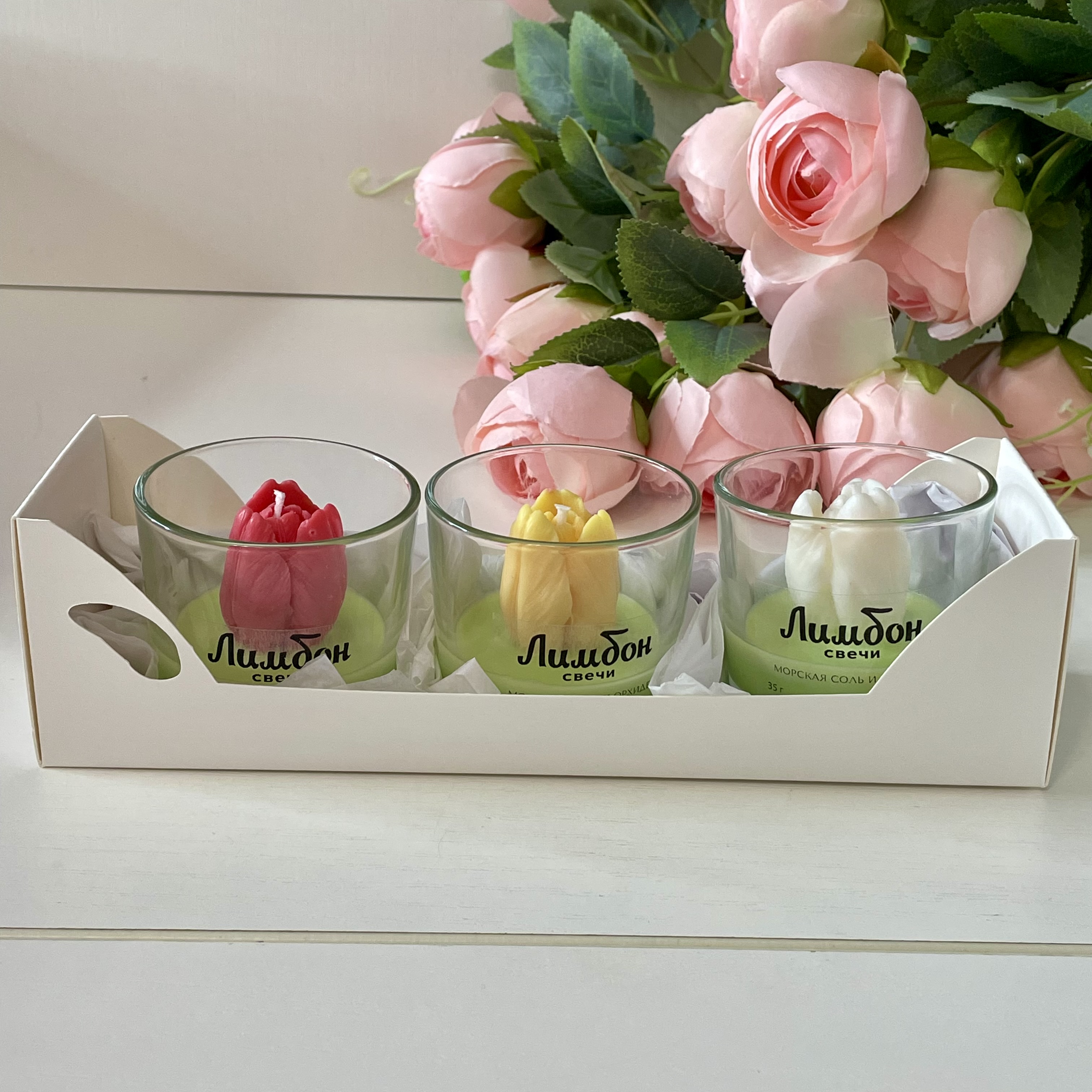 Набор ароматических свечей "Белый, Желтый и Красный тюльпаны"