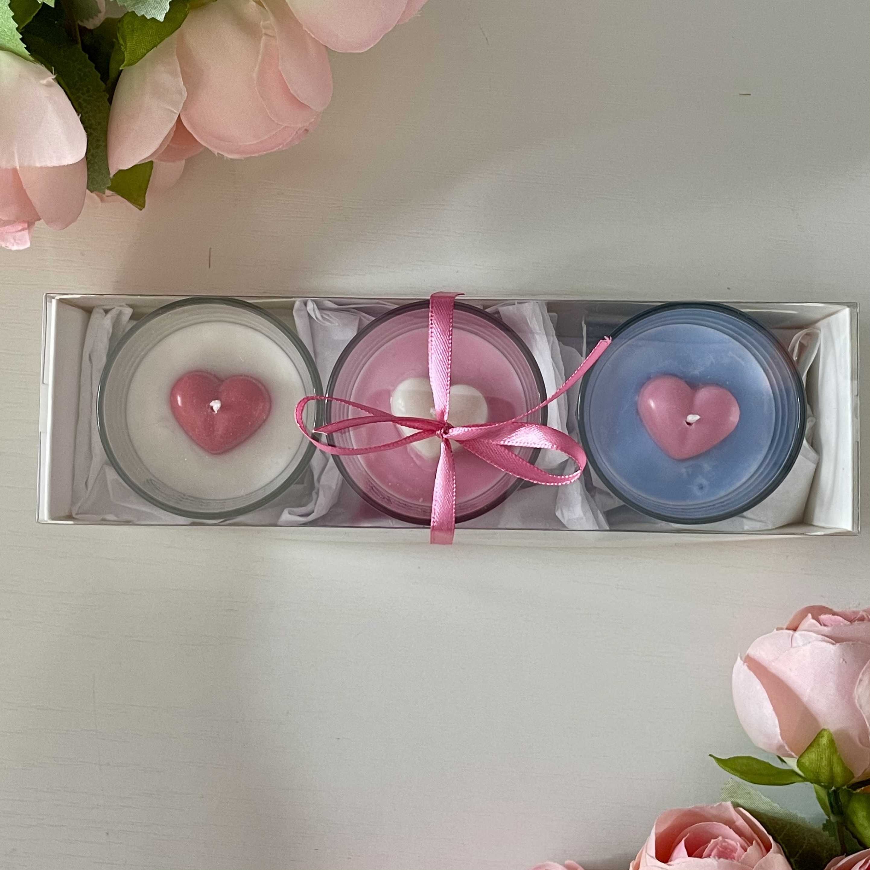 В набор входит 3 свечи с декором в виде сердечек и разными ароматами: