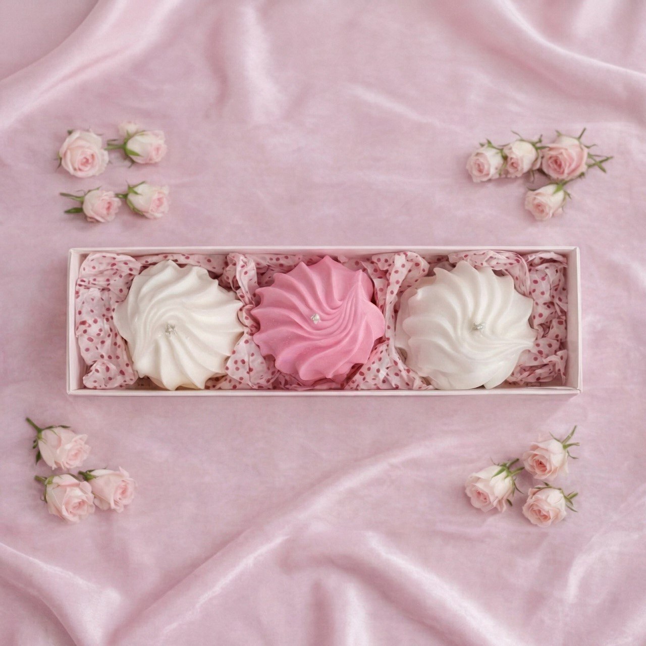 В набор входит 3 свечи в виде зефира - 2 с ванильным ароматом (цвет белый), 1 с клубничным ароматом (цвет розовый).