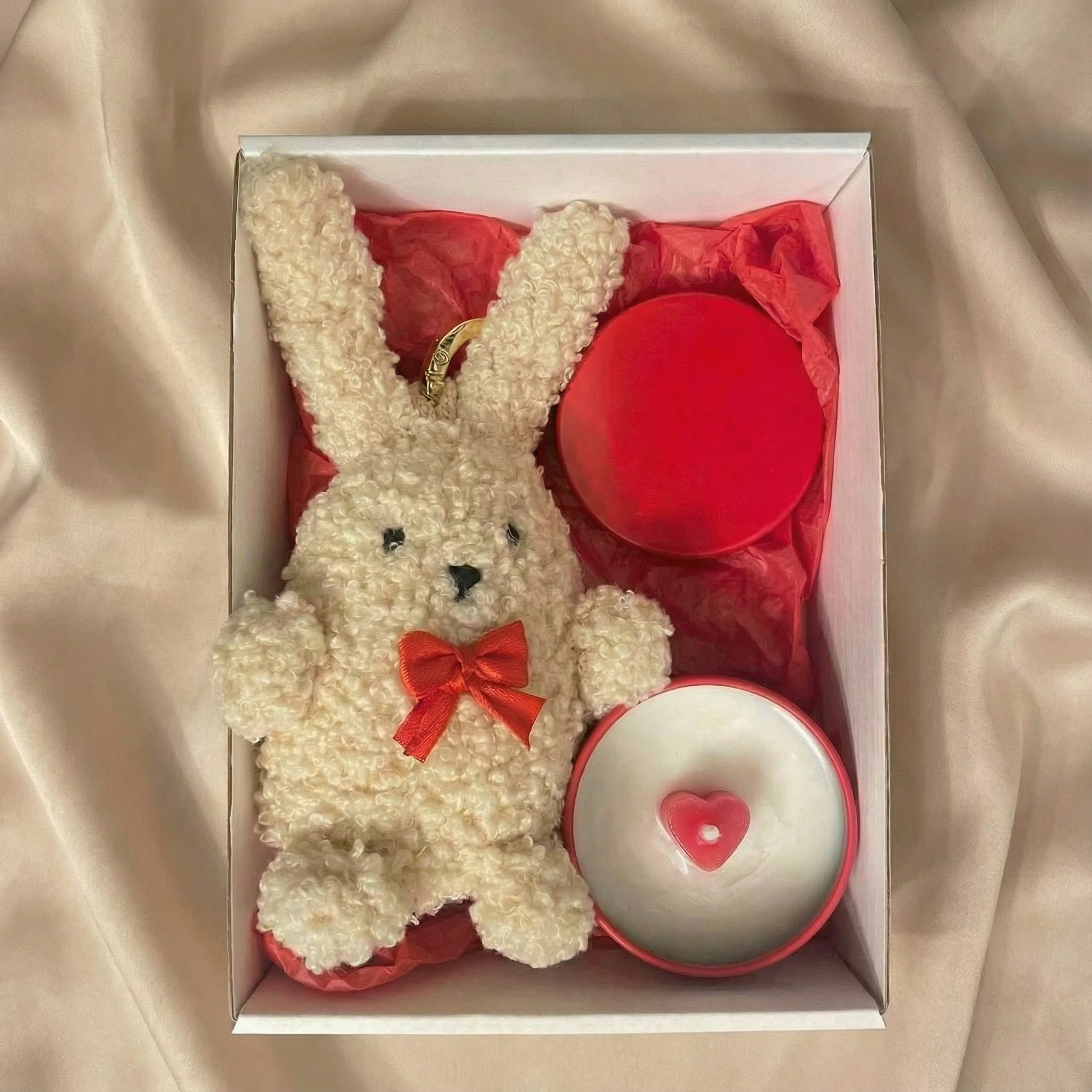 В состав набора входит игрушка-подвес Зайка с круглым карабином для крепления к сумке, рюкзаку и др. и соевая ароматическая свеча в круглой жестяной баночке с декором в виде сердечка и ароматом "Амаретто".