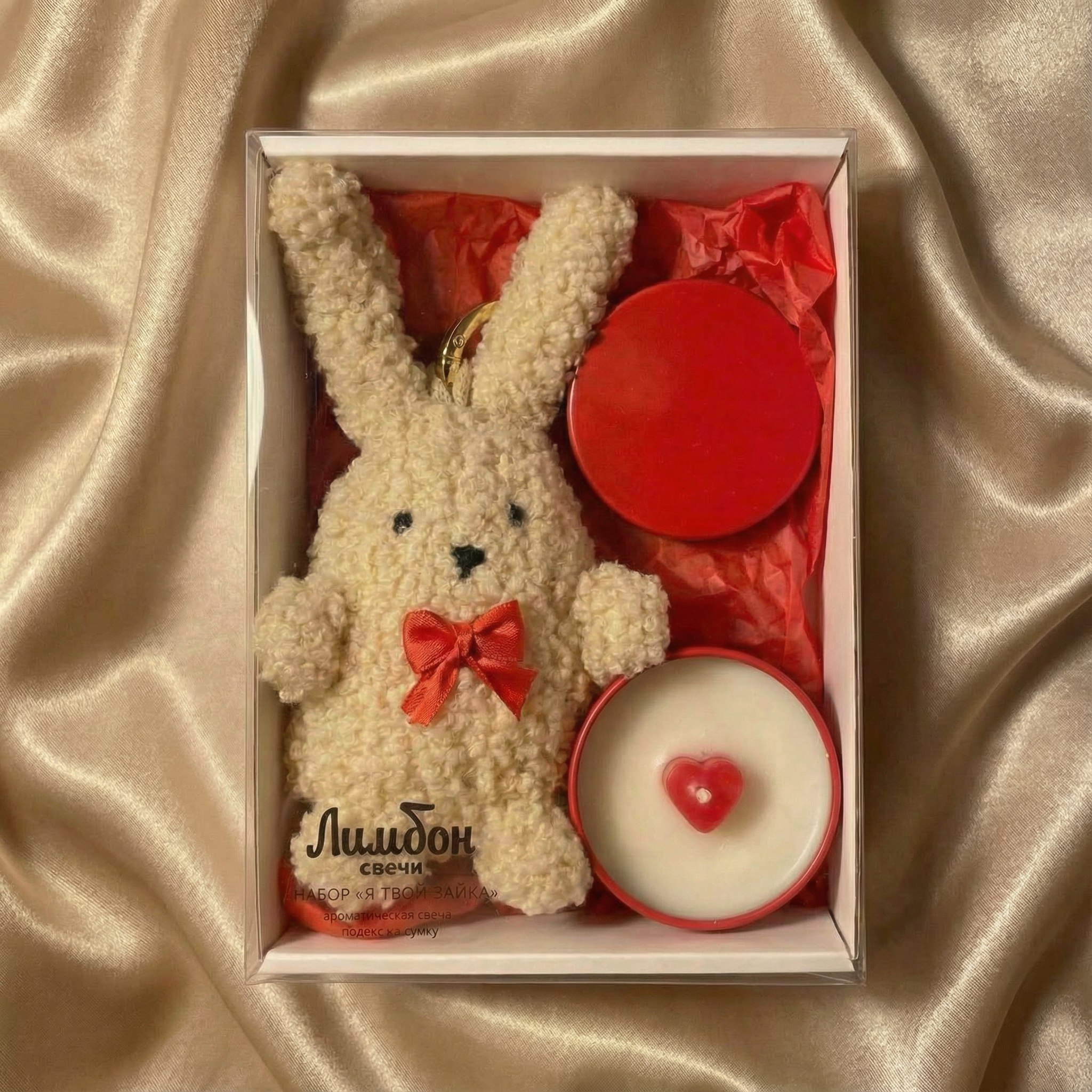 Набор «Я твой зайка» упакован в белую подарочную коробочку с прозрачной крышкой.